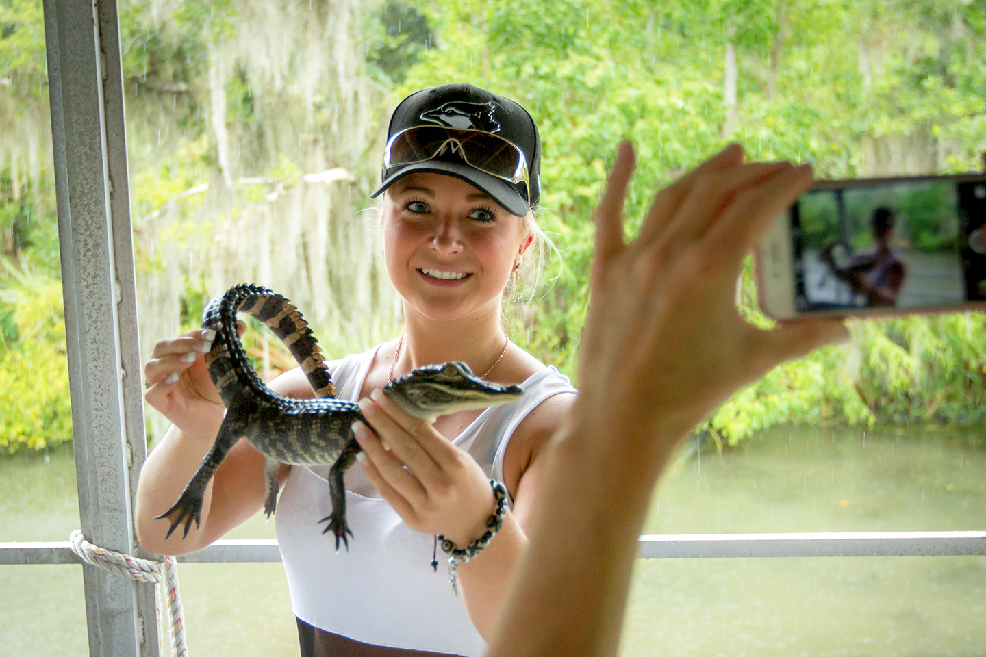 Then it’s a short ride from River Road to a privately-owned wildlife refuge within the Manchac Swamp, where homegrown Cajun captains will take you on a journey back to the early days of swamp and bayou exploration. They’ll guide the covered pontoon boat through the mystical cypress swamp while showing off the American Alligator and abundant wildlife. Learn the history of the town of Frenier and the Cajun culture of fishing, hunting, and trapping. Get the camera ready gators leaping up for a snack!